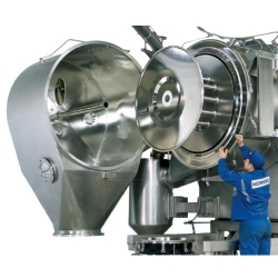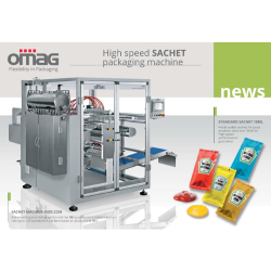 Balcony constructed frame. The frame is made with anodised aluminium. Tops, passage running boards, nuts and bolts are all made with stainless steel. The balcony constructed frame allows for maximum access for cleaning all the packaging areas. the sheath and tubes connecting the different parts of the machine are all located in the lower part of the frame (under the running boards). This area is accessible for maintenance and additional space is available for other groups or accessories which may be added. Valves, electrical junction boxes and water collecting trays are positioned in an easily accessible area in the back of the frame. The panels are fixed with RITTAL type locks. This frame allows for separation between the driving elements and the function groups. All greases or oils used for lubrication are FDA certified.