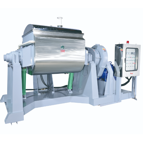 The kneading machine (SY-KM) uses two kneading arms to provide strength which compresses and shears force to allow material to be well kneaded. The chamber of SY-KM is designed as U-shape outside of tank and W-shape inside of tank so as to allow material inside of chamber could be mixed well and evenly. The equipment also has functions of vacuum, heating, cooling and compressing.