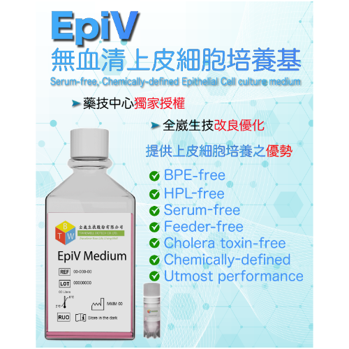 EpiV Medium 培養基是一款無血清 (Serum-free)、無牛腦垂體提取物 (Bovine Pituitary Extract, BPE-free)、無人類血小板裂解液 (Human Platelet Lysate, HPL-free)、無霍亂毒素 (Cholera Toxin-free)、化學成份明確 (Chemically-defined) 的上皮細胞培養基,用於上皮細胞 (Epithelial cells) 與角質細胞 (Keratinocytes) 的培養與擴增,無需使用滋養細胞 (Feeder-free),並同時可避免纖維母細胞 (Fibroblasts) 的生長,提供細胞培養最佳的貼附與生長環境,加速細胞增值的速率。
